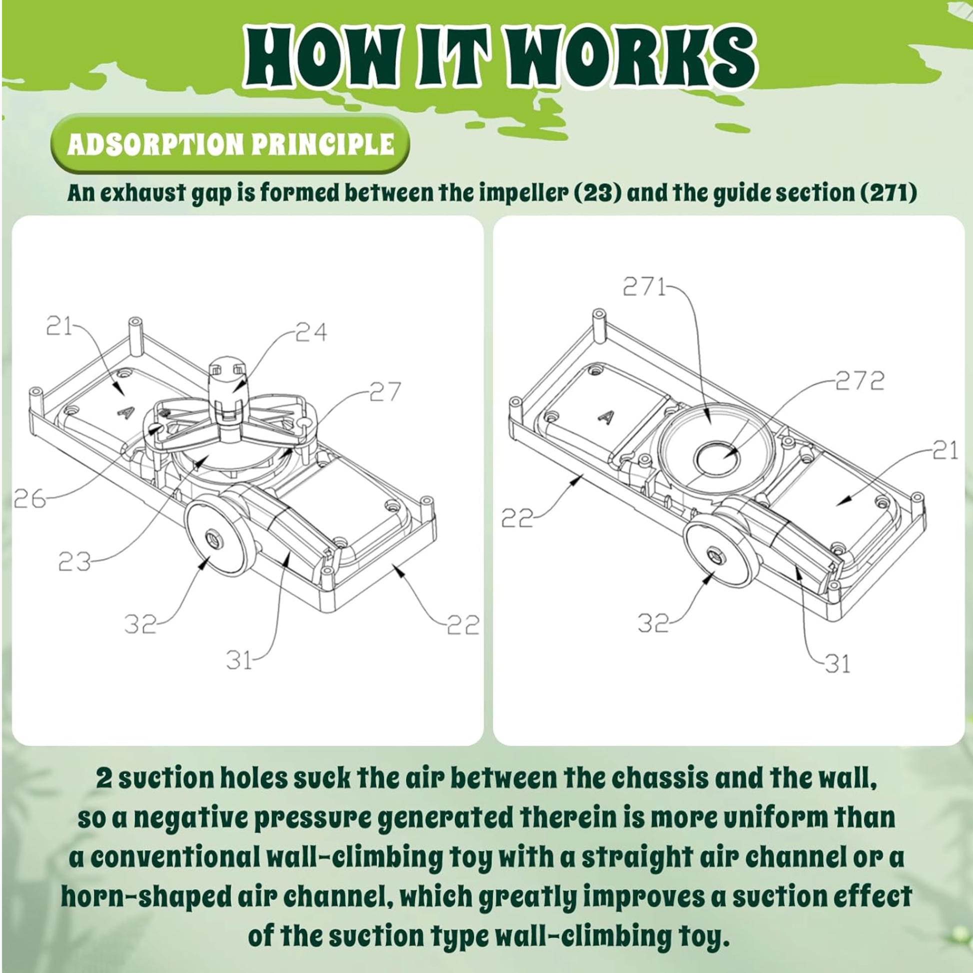 Works on glass, tiles, wood, brick, and more. Strong suction grip allows it to crawl on virtually any smooth surface.